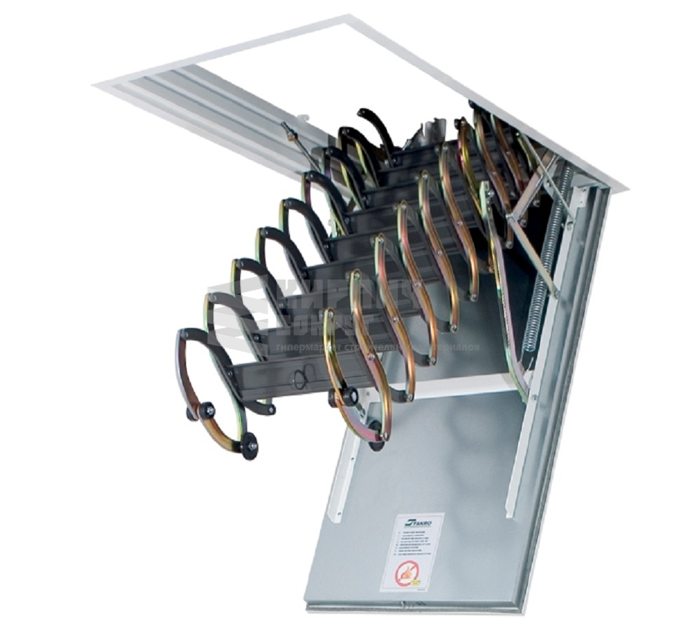 Металлическая чердачная лестница LST оснащена энергосберегающей термоизоляционной крышкой люка (толщина крышки с утеплителем – 36 мм) белого цвета. По периметру люка установлен контур уплотнения, обеспечивающий высокую степень герметичности. Благодаря «ножничной» системе складывания в сложенном виде лестница очень компактна и имеет небольшой размер крышки люка. S-образные боковые элементы лестницы выполняют роль поручней и придают лестнице современный вид. Рекомендуемая высота установки 260-280 см.